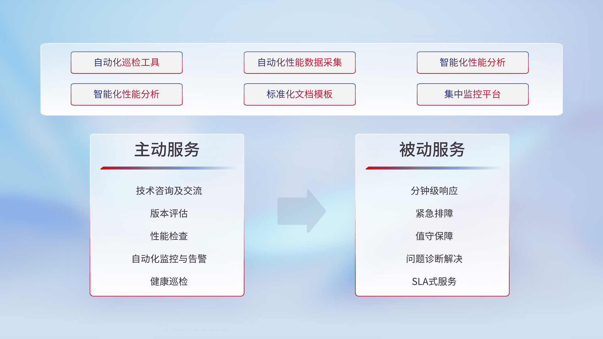 智能化工具和标准化文档,,,保障服务质量,,提供主动服务(包含技术咨询、、、版本评估、、、、性能检查、、自动化监控与告警、、、、健康巡检)和被动服务包含(分钟级响应、、、、紧急排障、、值守保障、、、、问题诊断解决、、、SLA服务)。。。。